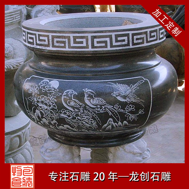 寺廟石雕香爐,佛教中稱它寶鼎,除了方形的香爐外,還有圓形。圓形香爐都有三足,一足在前,兩足在后,是如法的放置;常以之譬喻佛教中的三寶,缺一不可。中華民族香文化發展得很早,古時候的人就常以焚香木熏居室以除臭穢,所以古人讀書彈琴,喜歡先焚一爐香,可以凈雜念而使精神集中。重視欽水思源,慎終追遠是中國人的美德,所以自古以來,華人都拜天地神祗,祭祖先;上香表示敬意,是祭拜儀式中的一個主要項目,香爐就派上用場了。