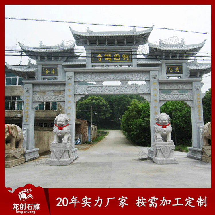 有關于村口石牌坊定做它樣式也是會影響到牌坊價格的預算。有些石牌坊它的造型是比較簡單的,一般只有一個門的,上面也是沒有什么裝飾的,這種牌坊它的價格一般不會很高,大概在幾萬元左右的價格就差不多了。而那種造型比較好看,門比較多的這種石牌坊它的價格就會比普通的價格高了,這種的價格大概會在十幾萬元左右,樣式越復雜,價格就越貴。