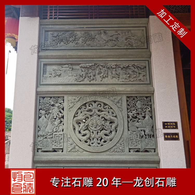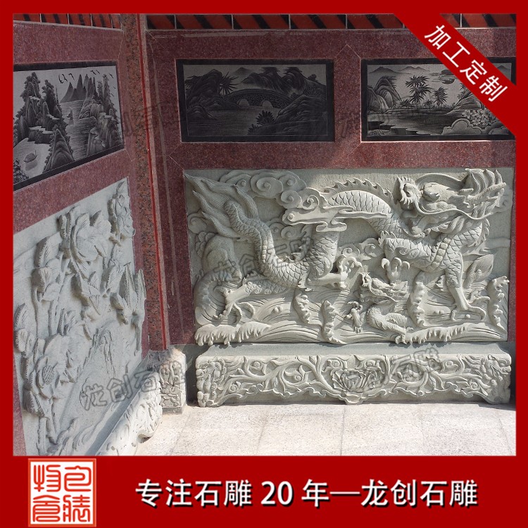 寺廟浮雕墻制作的厚薄度選擇一般有所屬物象的性質、雕塑的主題內容、放置位置及光線強弱等因素決定。浮雕壁畫作為我國傳統建筑中所特有的獨立構建,被廣泛用于不同類型的建筑中,青石是各種石材中環保的石材,因其取材方便,自然存量巨大,耐磨,耐風化,無輻射。