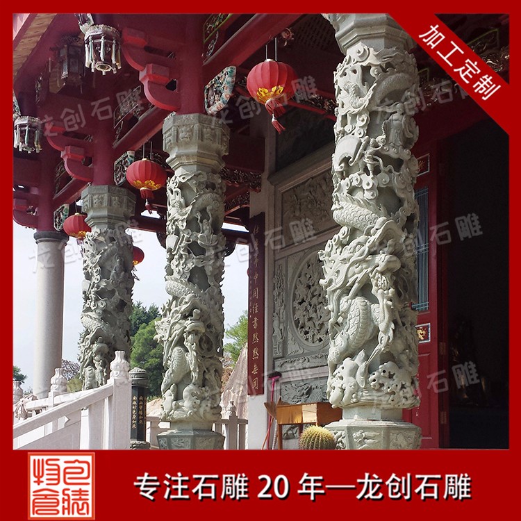 現在修建一些寺廟、家族祠堂、廟宇之類的都會在門口放置兩根石龍柱、或者更多,使其建筑顯得更加壯觀,該如何選擇哪種造型,哪種比較適合自己的建筑,下面我就帶你們來了解一下這方面的相關知識。現在使用的石龍柱分為兩種,一種是雕刻一條龍的,纏繞在石柱上面龍頭朝向正前方,龍身以外有祥云和山水襯托,嘴里面吐出水浪和龍珠。而另外一種就是雕刻兩條龍,兩個龍頭都朝向中間的位置,中間會有一個火龍珠,這樣的被稱作二龍戲珠。