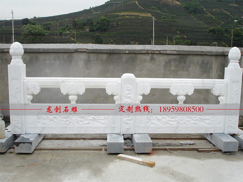 漢白玉顏色美觀,石材花紋清晰,漢白玉價格昂貴,根據不同的等級從特技漢白玉開始劃分,價格自然也不一樣,同時不同的地方生產的漢白玉價格也是不同的。龍創石雕雕刻的這款漢白玉石雕漢白玉欄桿顏色通體發白,長方體立柱上表面浮雕飛鳳,在立柱頂部是浮雕飛龍的圓柱,欄桿欄板以動物的形狀雕刻,兩只漢白玉石獅子前腳踩在一顆石球上,背上各有一只小獅子,這款欄桿雕刻了多種吉祥寓意的動物,雕刻工藝復雜,寓意豐富,適合高檔場所使用。