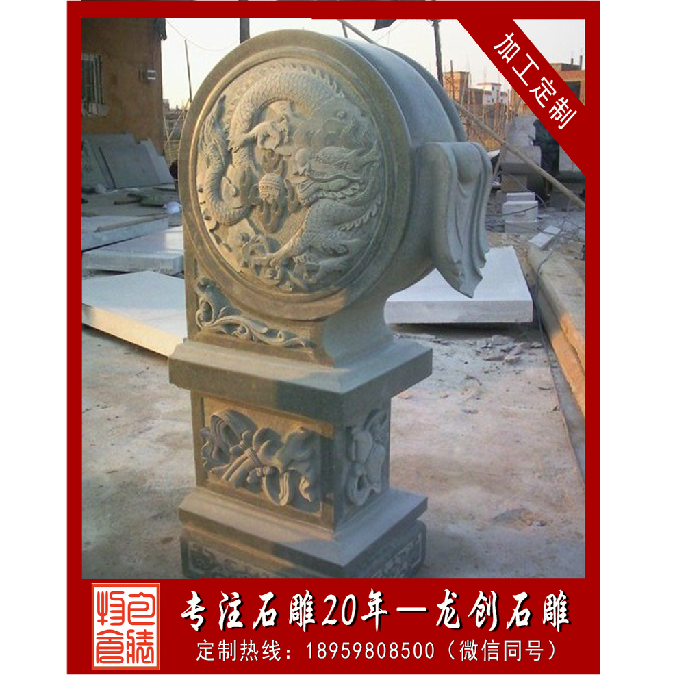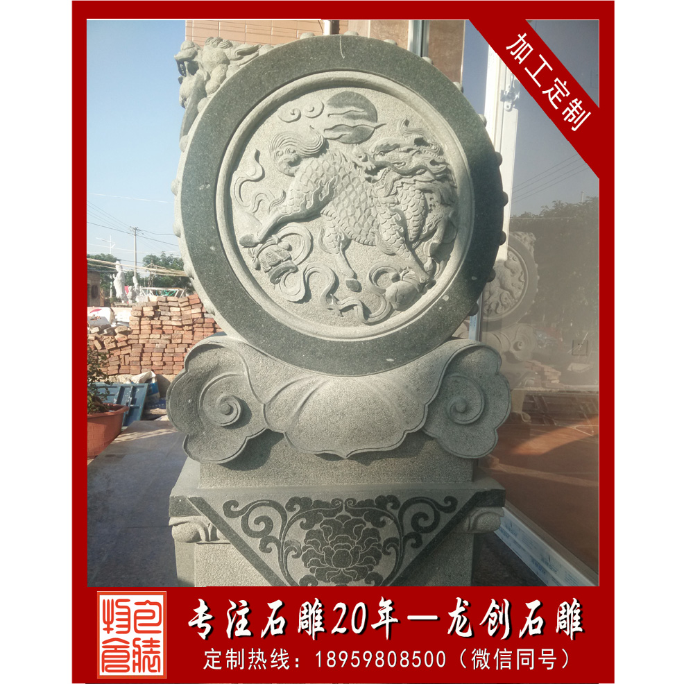 抱鼓石上雕刻麟、鳳、鹿、鶴、猴、鵲、蜂等瑞獸祥禽,形神兼?zhèn)?,姿態(tài)各異。如麒麟臥松、犀牛望月、獅子舞繡球、鶴鹿同春,還有三獅戲珠(三世戲酒)、四獅同堂(四世同堂)、五獅護(hù)欄(五世福祿)等圖案。另有在門前單獨(dú)立石獅,借助獅子的威猛守護(hù)大門,又因“獅”與“事”諧音,便以雙獅寓意“事事如意”、“事事平安”。守門的石獅,雄左雌右,雄獅腳下按一繡球,母獅腳下按一幼獅,繡球象征權(quán)力,幼獅象征子嗣,即表示“子嗣昌盛,世代為官”。
