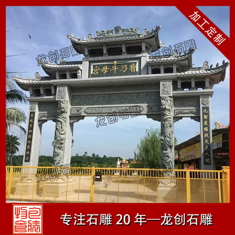 牌坊上經常看到浮雕龍在中國的傳統文化中是吉祥的象征,龍在云中翱翔,將優美的姿態展現給世人看,線條流暢;寓意龍龍四海,還有石獅子抱鼓石有鎮宅等作用,花鳥、圖案、龍鳳及各種瑞獸等都有祥瑞之意,修建這樣的石雕牌坊大門,更能令村莊吉祥如意。龍創石雕專注牌坊制作20年,堅守工匠本心,將每一座牌坊制作都追求優質。